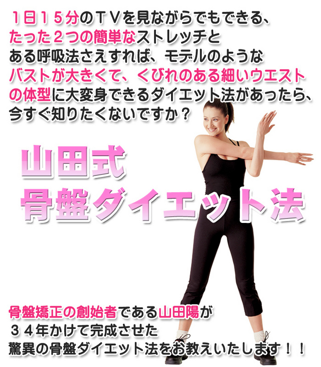 このブログは、美容矯正の専門家、山田陽さんのDVD「山田式骨盤ダイエット法」を紹介するブログです。山田陽さんは、雑誌、テレビでもおなじみの美容矯正の創始者です。DVDは、スキルアップを目指しているエステティシャンの方々にも必見の内容となっています。